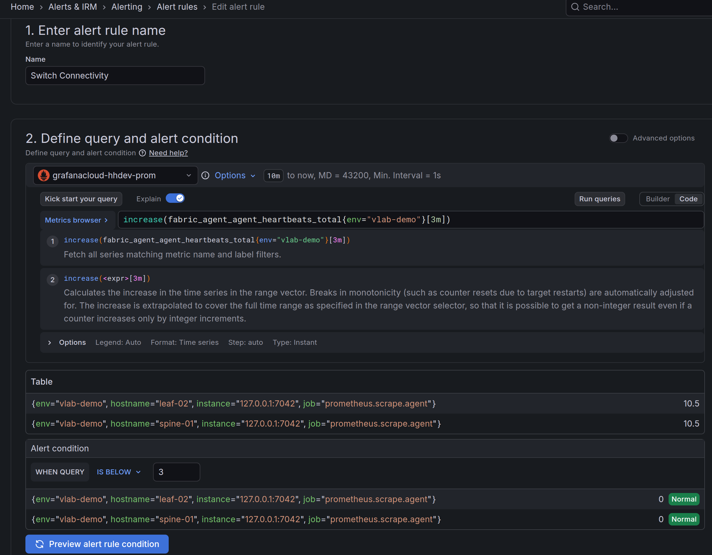 fabric_agent_agent_heartbeats_total metric. In normal operation the switch agent sends two